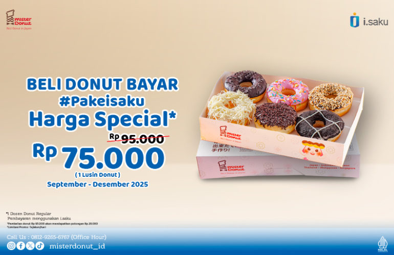 Updated on November 13, 2025November 13, 2025/ Admin Head Office Promosi Mister DonutMister Donut Periode: 1 September-31 Desember 2025 Syarat dan Ketentuan: Dapatkan harga spesial Rp75.000 setiap pembelian 1 Dozen Mister Donut Reguler khusus pembayaran menggunakan i.saku Promosi hanya berlaku di Flagship Mister Donut Maksimal 1x/akun/hari